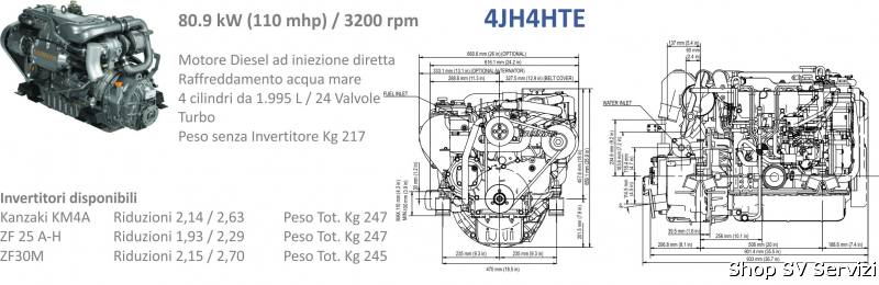 <p class="nero16"><span>YANMAR&nbsp;</span><span>4JH4HTE Motore Marino 110 HP (Kw 80.9)</span></p> <p class="nero16">Motore Diesel ad iniezione diretta con scambiatore di calore</p> <p class="nero16">4-cilindri in Linea - Turbo</p> <p class="nero16">Cilindrata 1,995 L</p> <p class="nero16">Peso a secco al volano: 217 Kg.</p> <p class="nero16">EU RCD / US: EPA Tier2 / BSOII &amp; EMC</p> <p class="nero16">Codice:&nbsp;MY 4JH4HTE&nbsp;</p> <p class="nero16"><strong>Invertitori disponibili</strong></p> <p class="nero16">Kanzaki KM4A Riduzioni 2,14 / 2,63 Peso Tot. Kg 247</p> <p class="nero16">ZF 25 A-H Riduzioni 1,93 / 2,29 Peso Tot. Kg 247</p> <p class="nero16">ZF30M Riduzioni 2,15 / 2,70 Peso Tot. Kg 245</p> <p>&nbsp;</p> <p>&nbsp;</p>