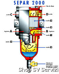 SEPAR 2000 è un separatore d’acqua e un filtro gasolio.Un sistema centrifugo multiplo innovativo fornisce la soluzione ai problemi d’acqua e impurità nel gasolio.