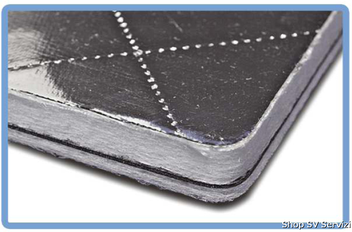 Prodotto fonoisolante multistrato a base di particolare massa polimerica e di fibre di poliestere protette da tessuto in fibra di vetro.