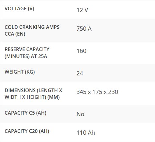 12 Volt - 750 A CCA - Cacità di Riserva a 25A pari a 160 minuti - Peso 24 Kg. - Dimensioni in mm. 345 x 175 x 230.