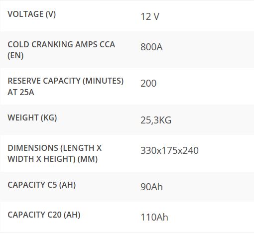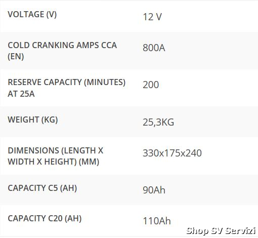 12 Volt - 800 A CCA - Capacità di Riserva a 25A pari a 200 minuti - Peso 25.3 Kg. - Dimensioni in mm. 330 x 175 x 240.