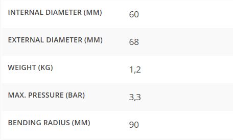 The completely smooth internal surface of the hose will reduce back pressure in the engine. Exhaust hoses with an internal diameter up to Ø 152mm have a bending radius of 1,5 x the diameter. Exhaust hoses with an internal diameter of more than Ø 152mm have a bending radius of twice the diameter. Temperature resistant between -30º + 100ºC with brief temperatures of 115ºC.