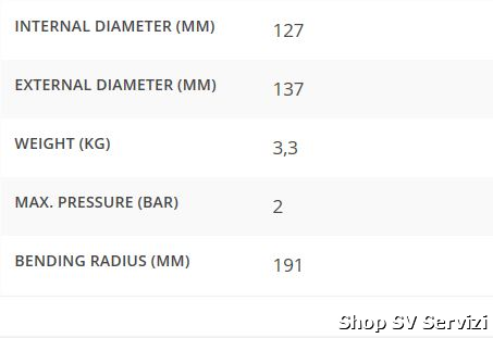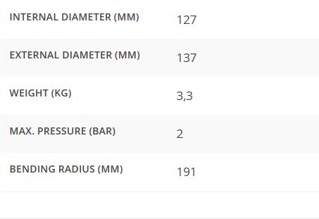 The completely smooth internal surface of the hose will reduce back pressure in the engine. Exhaust hoses with an internal diameter up to Ø 152mm have a bending radius of 1,5 x the diameter. Exhaust hoses with an internal diameter of more than Ø 152mm have a bending radius of twice the diameter. Temperature resistant between -30º + 100ºC with brief temperatures of 115ºC.