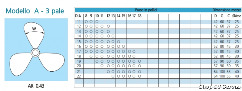 Elica Mikado 3 pale tipo A diam. 11" (pollici), passo da comunicare, diametro asse da comunicare, destra o sinistra A.R. 0,43%