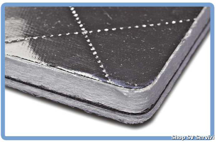 Prodotto fonoisolante multistrato a base di particolare massa polimerica e di fibre di poliestere protette da tessuto in fibra di vetro.