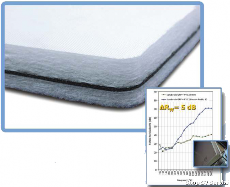 Prodotto fonoisolante multistrato a base di particolare massa polimerica e di fibre di poliestere protette da tessuto in fibra di vetro.